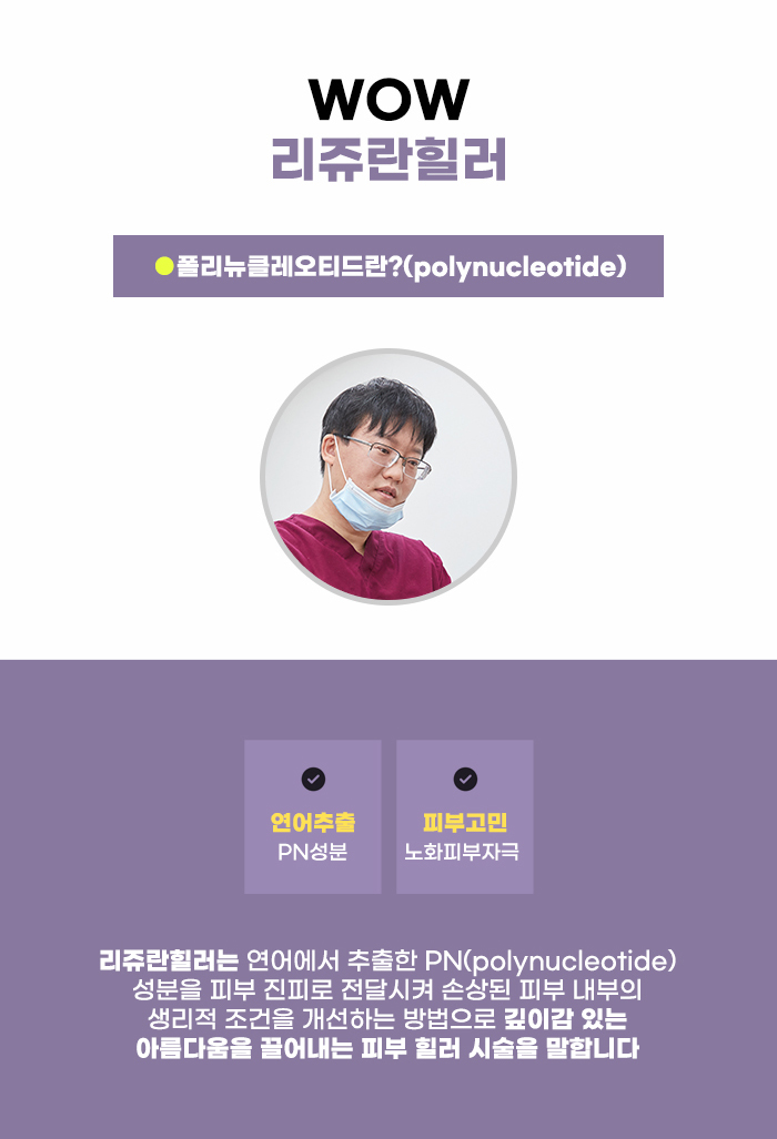 연어에서 추출한 성분을 피부 진피로 전달해, 피부 내부의 생리적 조건을 변화시키는 것을 기대할 수 있다고 합니다. 이 PN 성분은 폴리뉴클레오티드라고도 하는데요, 연어에서 추출 정제한 특이 뉴클레오티드 성분이라고 합니다. 열에 안정적인 물질로, 피부 재생 능력을 다시 활성화하는 것을 돕는 걸 기대할 수 있다고 하는데요, 피부 속 환경 변화, 피부 구조 복원 등을 기대할 수도 있다고 합니다.