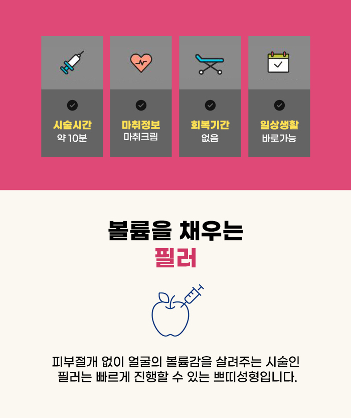 주사 관리이면서 필러제를 주입해 즉각적으로 변화를 느낄 수 있는데요, 오랜 시간 동안 기다려야 하는 관리, 시간이 오래 걸리는 관리, 관리 후 긴 시간 동안 휴식해야 하고 일상생활로 바로 복귀하기 힘든 관리 등을 원하지 않는 분이 많을 것 같은데요, 필러 관리는 빠르고 간편하게 진행할 수 있으며 관리 후 바로 일상생활을 할 수 있다는 장점이 있습니다.
