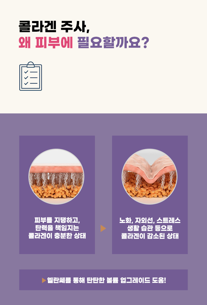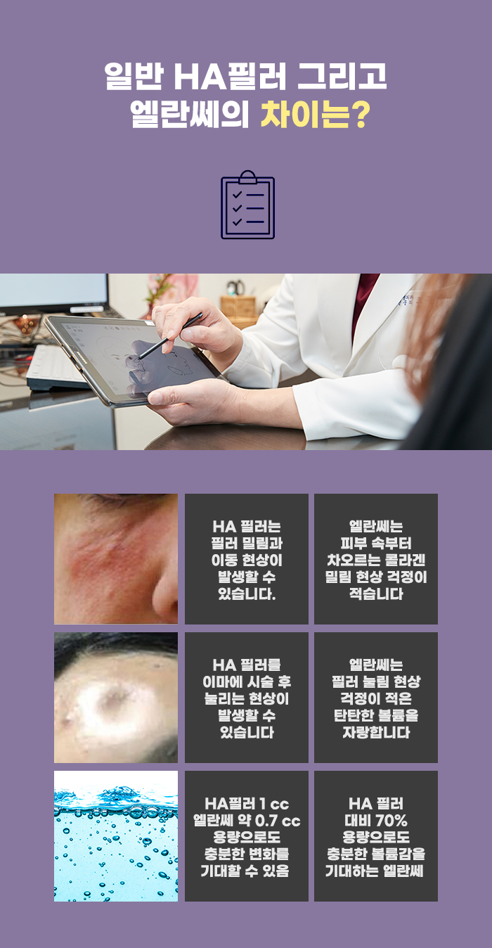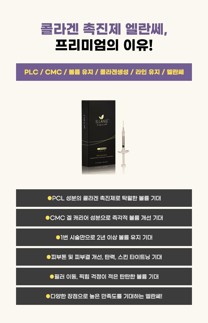 그런데 피부밑에서부터 탄탄하게 받쳐주는 콜라겐이 소실될 경우, 얼굴의 볼륨이 줄어들고, 패인 주름이 생기기도 합니다. 필러 관리를 이런 이유로 찾는 분도 있을 것 같은데요. 그런데 보통의 필러와 다르게 엘란쎄는 콜라겐 형성을 돕는 성분도 있으며, 즉각적인 볼륨 형성을 돕는 겔 캐리어 성분도 있다고 합니다. 그렇기에 즉각적인 볼륨 형성과 탄탄하게 채워 올려주는 볼륨 변화를 기대할 수도 있습니다.