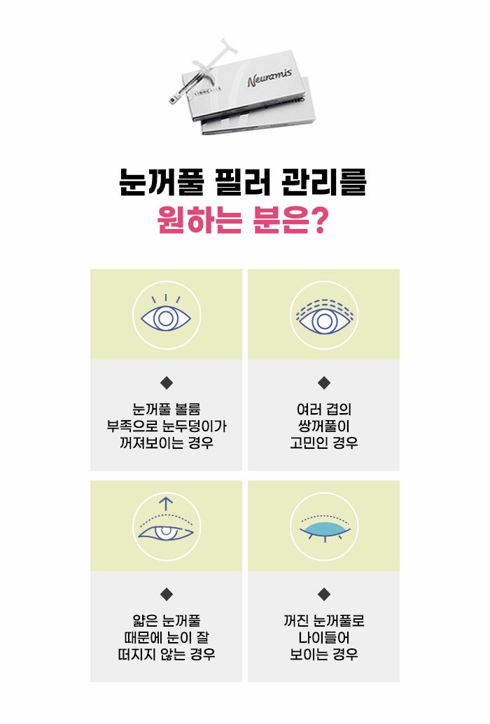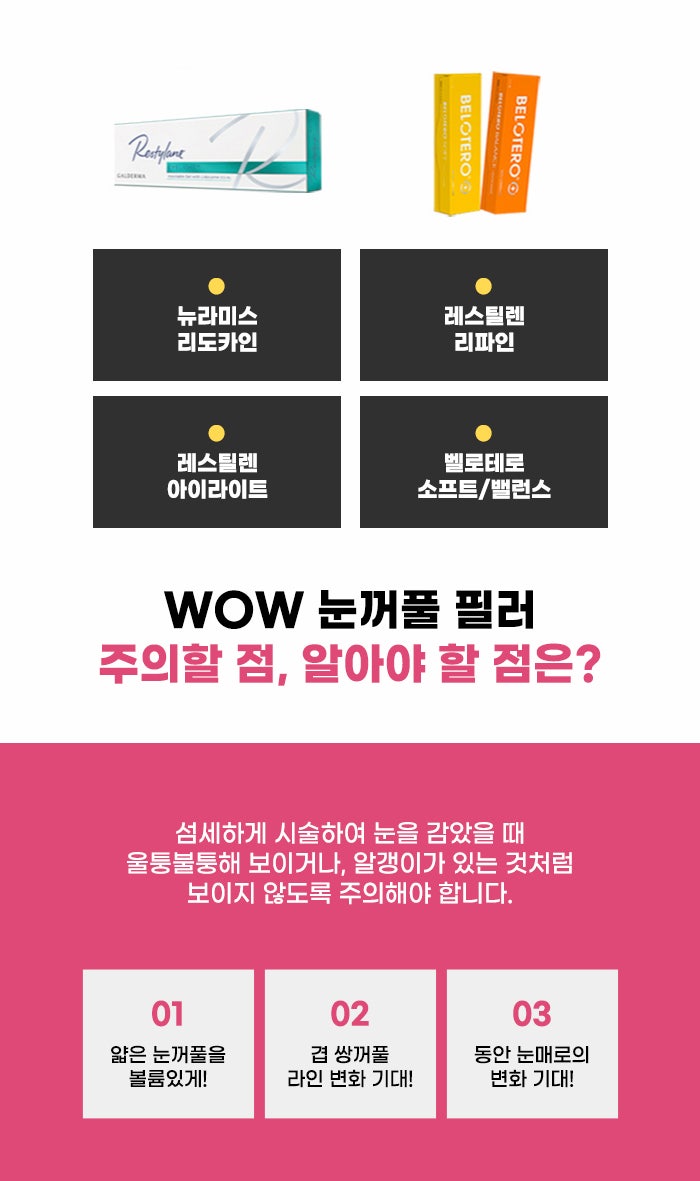 부위 특성상 눈꺼풀 부분은 얇은 부분이며, 움직임도 활발한 부분입니다. 또한 중요한 눈과 가까이 있는 부분이기도 합니다. 그렇다 보니 눈꺼풀 필러는 빨리 진행할 수도 있는 간단한 관리인 것 같아도, 쉽게 아무 곳에서나 해도 좋은 것은 아닐 것입니다. 사용하는 필러제, 주입하는 양, 균형 등을 고려해 필러 관리나 다른 쁘띠성형 관리를 알아보셨으면 합니다.