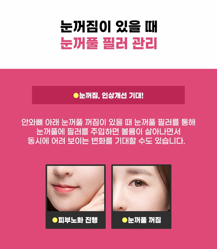 사라진 볼륨을 다시 찾아줄 수 있는 관리를 알고 싶다면? 눈꺼풀의 볼륨은 생각보다 중요할 수도 있는데요. 볼륨이 줄어들면서 겹 쌍꺼풀 문제가 생기기도 합니다. 그런데 눈 양쪽이 공평하게 변화가 생기는 게 아니라, 한쪽만 겹 쌍꺼풀이 생기거나 눈매가 달라 보일 수도 있습니다. 이런 경우 겹 쌍꺼풀 때문에 짝눈으로 보이기도 합니다. 그리고 외적 고민만 생기는 게 아니라 기능적 고민이 생겨서 강남 눈꺼풀필러 효과 알아볼 수도 있습니다.
