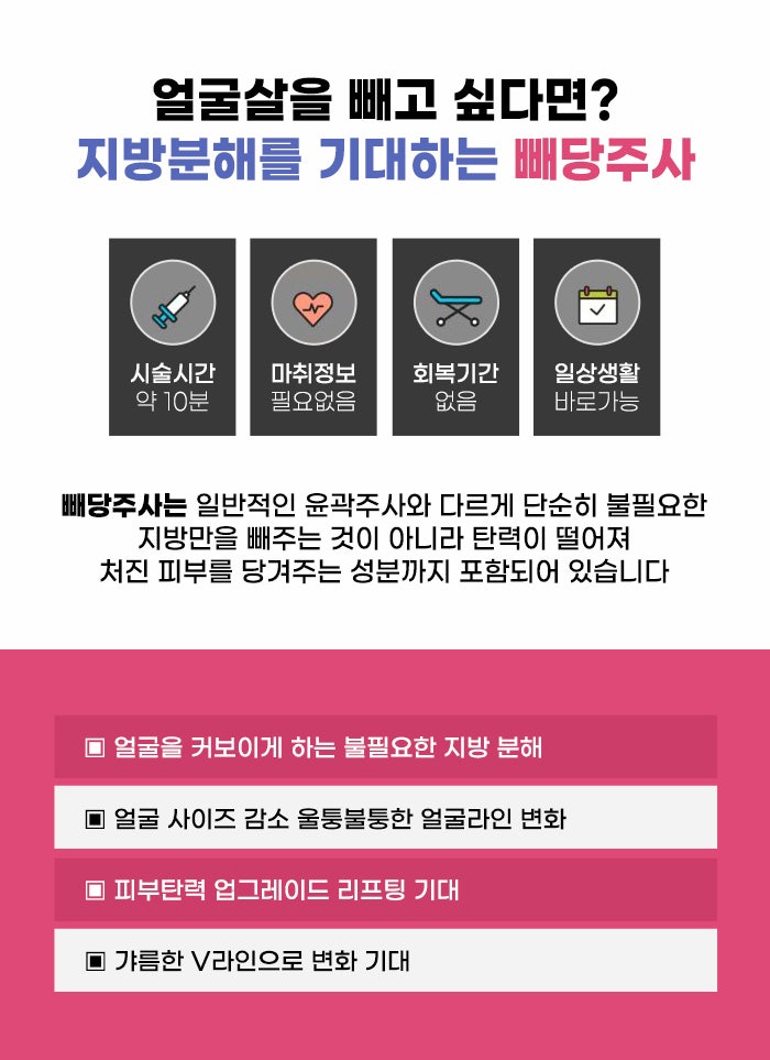 눈꺼풀에 있어야 하는 볼륨이 지나치게 적은 게 고민이 되는 것처럼, 얼굴에 지방이 너무 많은 게 고민이 되는 경우도 있습니다. 부족한 눈두덩이의 볼륨을 채우고 싶은 것처럼, 필요하지 않은 지방을 빼고 싶을 수도 있는데요. 이런 경우 균형을 찾기 위한 빼당주사 관리나 나에게 맞는 관리에 대해서도 알아보셨으면 좋겠습니다.