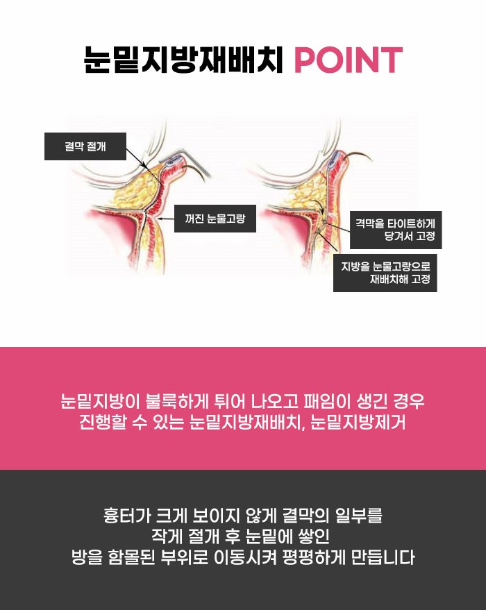 지방만이 불룩하게 나온 경우 불필요한 눈밑 지방을 제거하는 방법을 결정할 수도 있습니다. 하지만 눈 밑의 지방이 불룩하게 나와 있으면서, 동시에 패임이 생긴 경우도 있는데요, 눈 밑 패임이 있는 경우 지방을 그냥 제거하기만 하는 게 아니라, 필요한 부분으로 이동시켜 채워줄 수도 있다고 합니다. 이 방법은 눈밑 지방재배치라고 합니다.