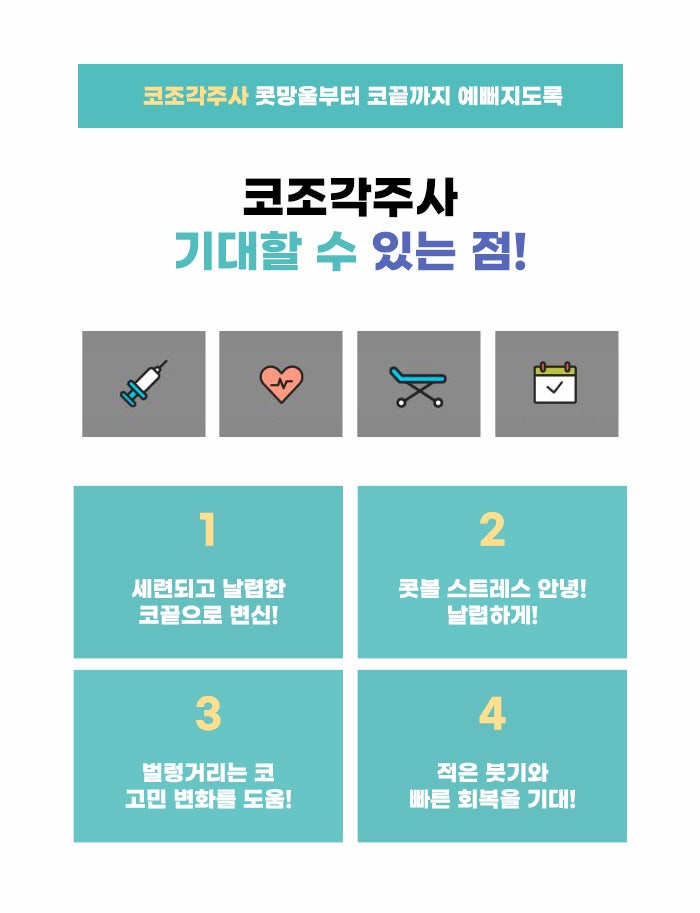 그렇기에 절개를 크게 하고 회복 기간이나 부기의 부담이 큰 수술을 원하지 않는 경우에도 쁘띠성형 관리를 통해 자신감을 찾기도 합니다. 또한 관리 과정이 간편한 편이다 보니 반복 관리를 받는 것도 쉬울 수 있는데요. 코조각주사의 경우 3회 정도의 반복 관리를 하는 경우가 많다고 하며 간격은 약 2주 정도의 간격으로 진행하는 편이라고 합니다. 현재 강남 콧볼축소 코조각주사 고민되는 편이라면 내 컴플렉스를 변화시킬 수 있었으면 합니다!