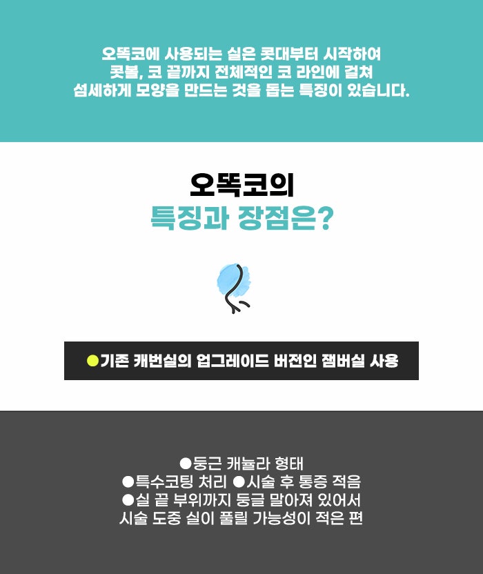 오똑코는 잼버실을 이용하는 리프팅 관리 중 하나로 보기도 하는데요. 둥근 캐뉼라 형태이면서 특수코팅 처리가 되어 있는 잼버실을 이용하는 오똑코에는 다양한 장점이 있다고 합니다. 우선 콧대부터 콧볼 모양 그리고 콧볼 모양과 코끝 등의 전체적인 코 선에 걸쳐 모양을 섬세하게 바꿀 수도 있다는 특징이 존재합니다.