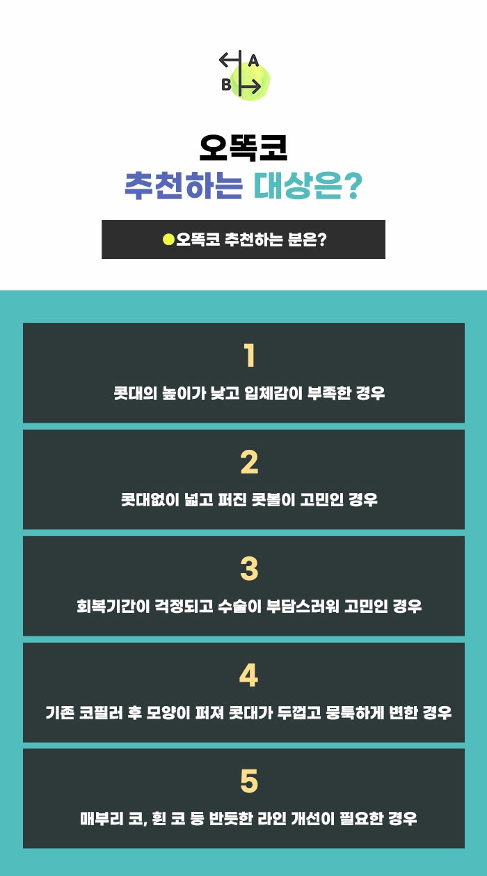 코의 라인을 바꾸고 싶어 하는 분 중에는 기존에 코필러 관리를 받았는데, 시간이 지나면서 마음에 드는 라인을 갖지 못해 스트레스를 받는 경우도 있는데요. 코필러 관리 후 빠르게 볼륨이 사라지거나, 원치 않는 결과를 얻는 경우도 있습니다. 퍼지고 모양이 뭉툭해진 코 때문에 고민하고 있는 분이라면 다양한 장점을 갖고 있는 오똑코 관리에 대해서도 확인할 수 있었다면 좋겠습니다.