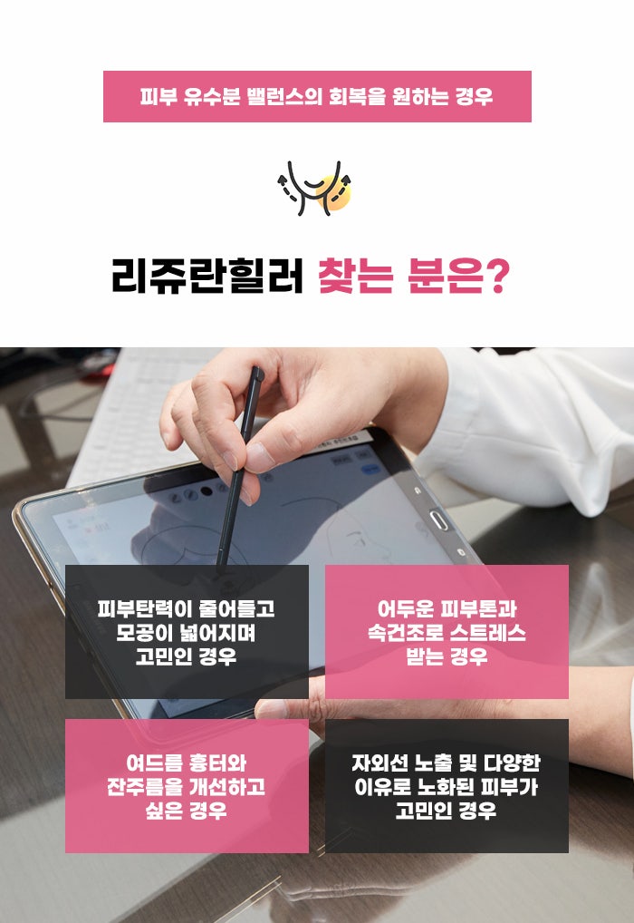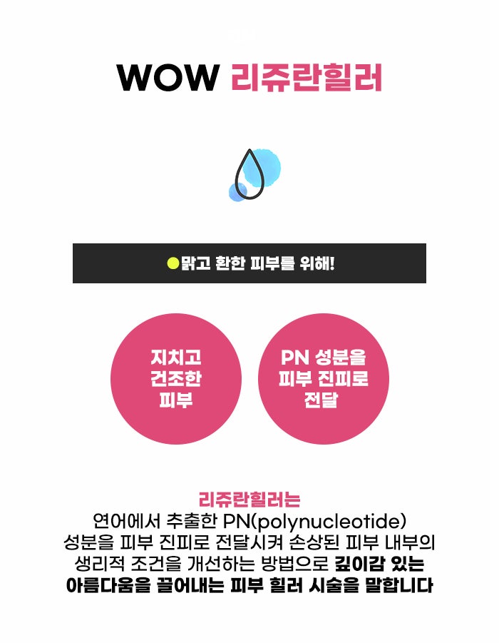 또래보다 더 나이들어 보여서 스트레스를 받으며 피부 노화에 대해서 고민하는 분도 많다고 합니다. 리쥬란힐러는 연어에서 추출한 성분을 이용하는 관리인데요, PN 성분을 진피로 전달하며, 손상된 피부 안의 생리적 조건 변화를 기대할 수도 있는 관리라고 합니다. 이 PN 성분은 폴리뉴클레오티드라고 하는데요, 특이 뉴클레오티드를 이용한다고 합니다.