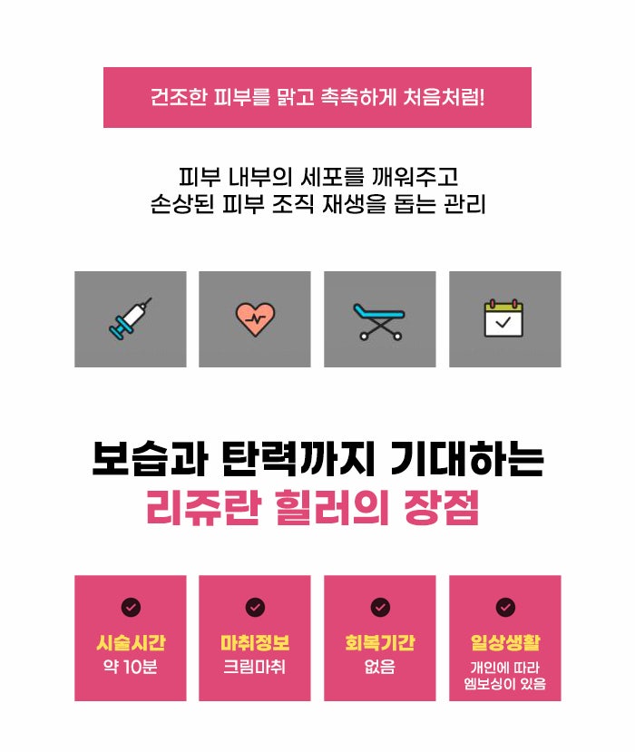 예뻐지고 싶다는 마음은 같더라도, 강한 통증을 무조건 견디고 싶은 분은 아마 없을 것 같은데요. 강남 리쥬란힐러 관리의 경우 통증 부담이 적은 편이라고 합니다. 회복기간의 부담도 적은 편이라는 장점이 있지만, 개인에 따라서 세부적인 관리 과정, 필요한 관리, 관리 과정에서의 부담이 달라질 수 있습니다. 부기, 회복기간, 엠보싱 현상 등의 변화도 다를 수도 있는데요. 그렇기에 강남 리쥬란힐러 고민이라면 자신의 상황에 맞는 관리를 결정했으면 합니다.
