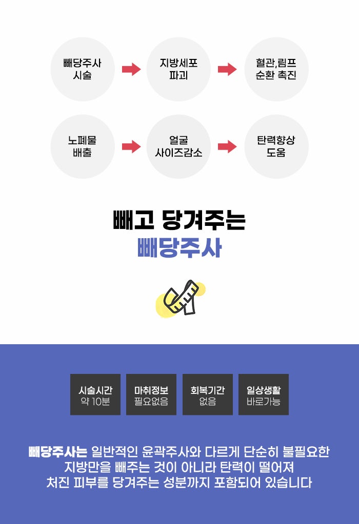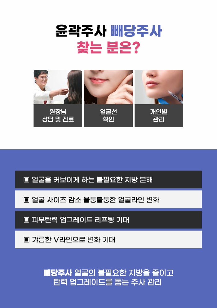 균형이 맞지 않는 턱선 때문에 불안정한 느낌을 받을 수도 있다고 합니다. 지방이 많은 턱선 때문에 턱이 더 부해 보이기도 하는데요. 이런 경우 윤곽주사 빼당주사 관리를 통해 더욱 날렵한 선을 찾게 될 수도 있다고 하니 참고하셔서 필요한 자세한 정보를 확인하고 좋은 결정을 할 수 있었으면 합니다.