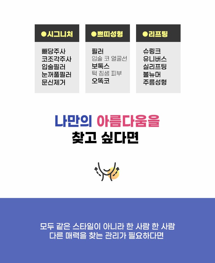 그렇기에 수술적인 과정을 선택하는 것은 쉽게 결정하는 게 아니라 신중하게 결정해야 하는데요. 장점과 특징을 따져보고, 내가 얻을 수 있는 장점, 그리고 고려해야 하는 단점 등을 확인해야 합니다. 현재 강남 턱끝필러 추천 정보 알아보는 분의 경우, 턱과 관련한 수술을 하는 것은 부담이 되지만 턱선을 바꾸고 싶은 분도 있을 것 같습니다. 또한 이전에 성형 수술을 하고 난 후에 보완을 위해 쁘띠성형 관리를 찾고 보다 마음에 드는 라인을 만들고 싶은 분도 있을 것 같습니다.
