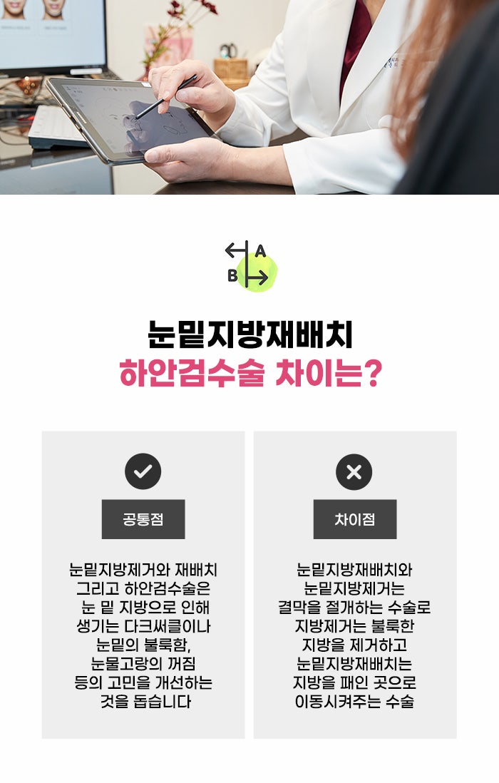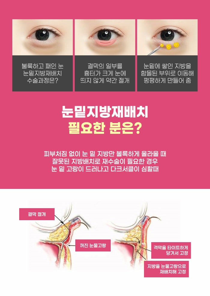 눈 밑의 지방이 튀어나와 있으면서 눈물고랑 부분이 패일 수도 있는데요, 이럴 때는 눈 밑의 지방을 그냥 없애기만 하는 게 아니라, 지방이 많은 곳에서, 패임이 있고 지방이 필요한 곳으로 이동해 채워주는 관리를 선택할 수도 있다고 합니다. 이 관리를 눈밑지방재배치라고 합니다.