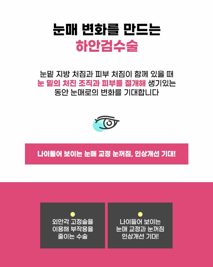 하안검 수술의 경우 여유 있는 피부, 근육을 제거하다 보니 약간의 당김 현상이 생길 수밖에 없습니다. 미세한 안검당김이 있는 경우 저절로 좋아지는 경우가 대부분이라고 합니다. 하지만 너무 강한 당김이 있고 안검외반이 생기는 경우, 시간이 지나도 나아지지 않고 안검외반이 있는 경우라면 교정술이 필요할 수도 있다고 합니다.