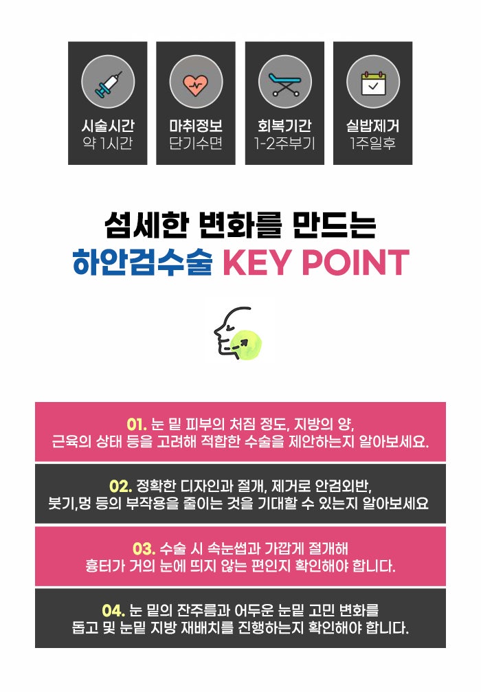 눈 밑 피부의 처짐 정도나 근육의 양, 지방의 양 등을 고려해 하안검수술이 진행되어야 하는데요. 강남 하안검수술 비용 문제도 빠질 수 없이 체크해야 하겠지만, 무엇보다 내 얼굴, 그리고 내 눈가 피부에 진행되는 관리인 만큼 강남 하안검수술 비용 문제만이 아니라 실력, 노하우를 꼼꼼히 확인하고 알맞은 곳을 결정하는 것도 중요하겠습니다.