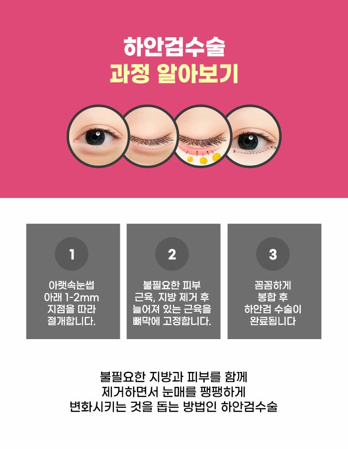 이럴 때 하안검수술에 대해서 찾아볼 수 있는데요, 눈 밑의 불필요한 조직을 제거하는 수술이 하안검 수술이라고 합니다. 하안검수술 과정을 통해 눈 밑의 처진 피부, 지방 등을 제거할 경우 더 젊어 보이고, 시원한 눈매를 만드는 변화를 기대할 수도 있다고 합니다.