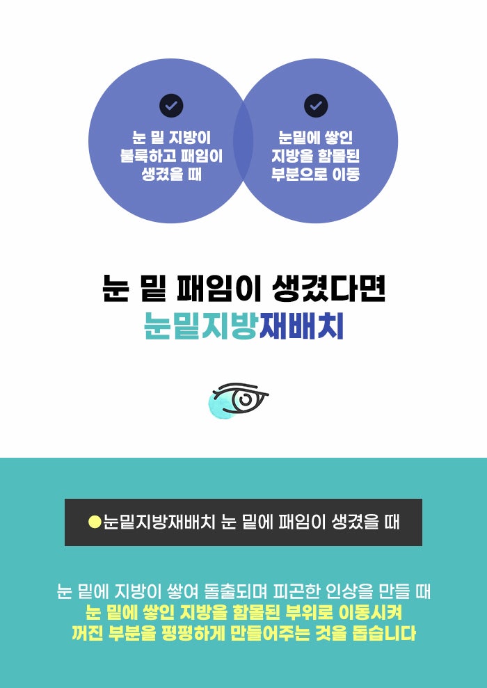 그리고 눈밑지방재배치 과정에 대해서 알아볼 때, 강남 눈밑지방재배치 부작용 관련해서도 신경 쓰일 수 있습니다. 눈 밑 지방재배치를 하고 난 후에 눈 밑의 처짐, 주름이 생겼거나, 혹은 눈 밑 지방재배치를 하고 나서도 패인 부분이 잘 가려지지 않는 것 같은 점에 대한 고민이 생길 수도 있는데요. 눈 밑 지방재배치를 할 때 지방을 떼어내 분할하고, 재배치하는 경우도 있다고 합니다.