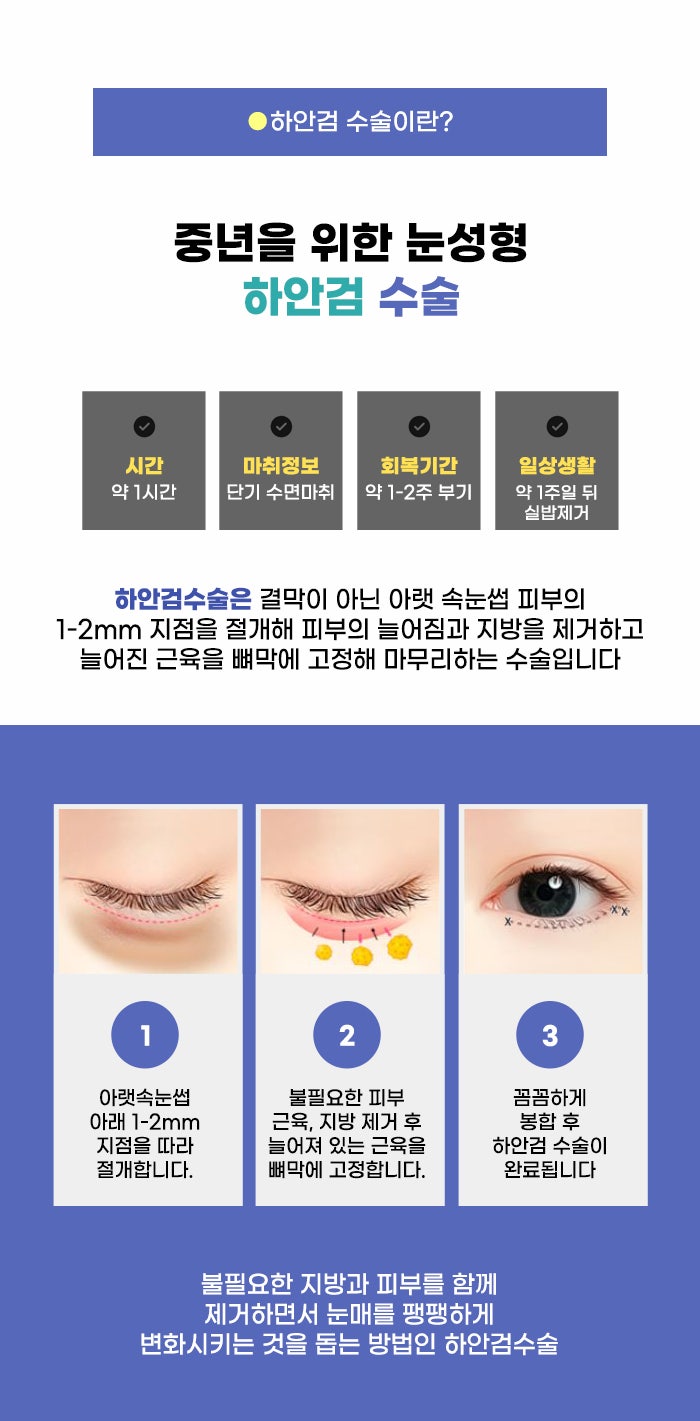 그렇기에 이런 경우 기존에 피부 처짐, 주름이 없는지 꼼꼼히 확인하고 하안검 수술 등 올바른 방법을 택하는 게 필요하겠습니다. 또한 눈 밑의 패임이 없는 상태라면 그냥 불룩한 지방을 없애는 방법만을 진행할 수도 있다고 하는데요. 이 경우에는 눈 밑 지방제거만으로 충분한지 꼼꼼히 체크하셨으면 좋겠습니다.