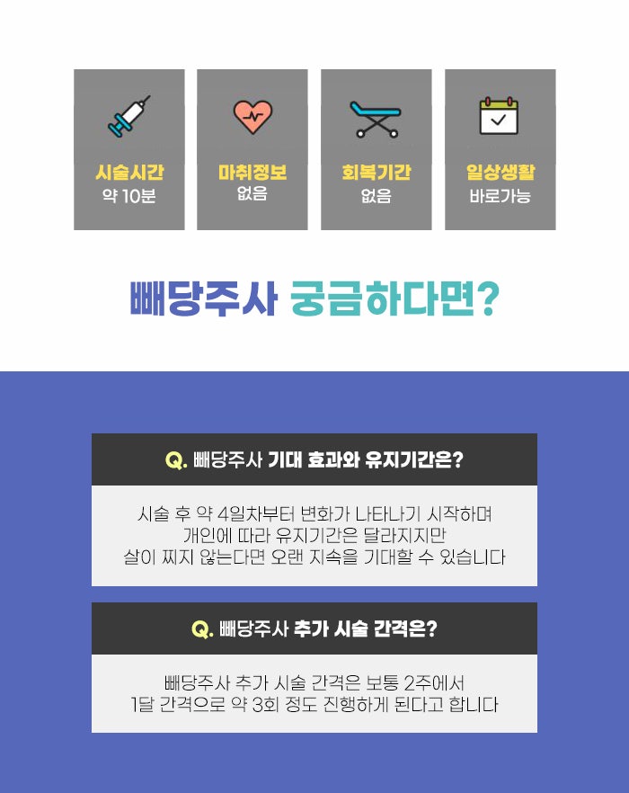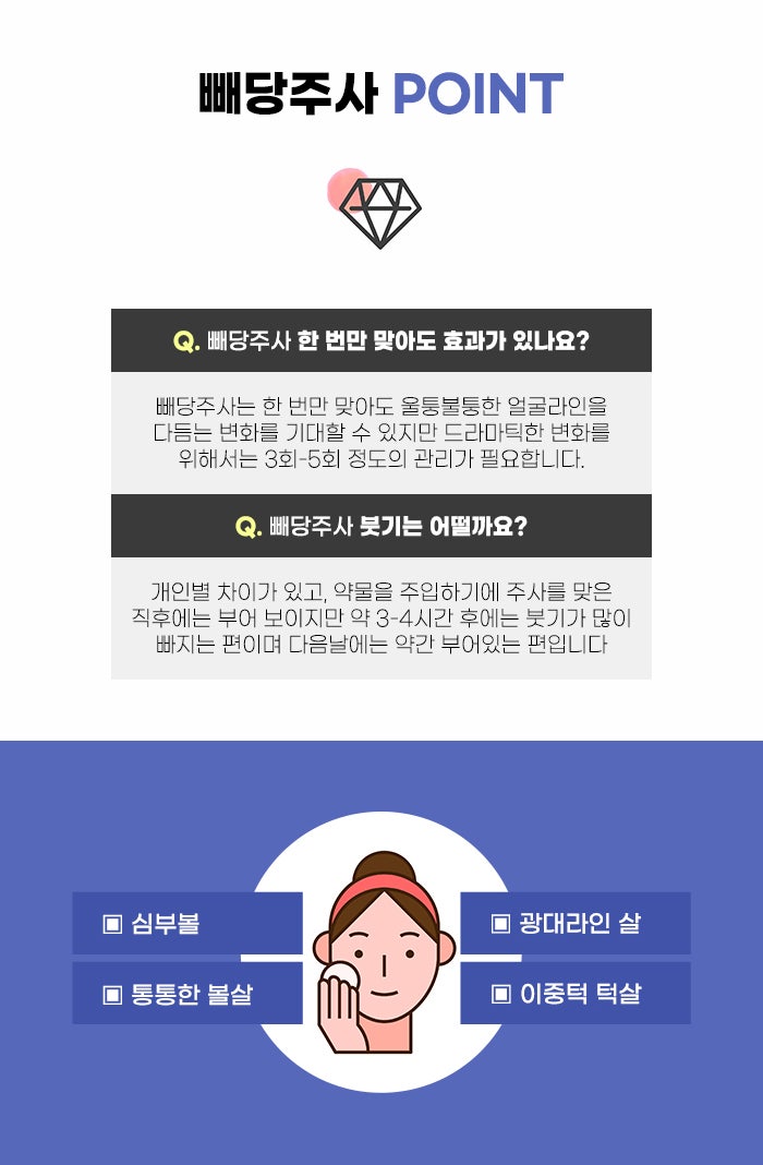 일반적인 윤곽주사와 다른 빼당주사의 특징에는 어떤 게 있을까요? 빼당주사는 불필요한 지방을 빼고 싶을 때 찾는 관리라고 하는데요. 또한 얼굴 살을 빼고 싶을 때 찾는 것 말고도 더욱 탄탄한 리프팅에도 도움을 기대할 수도 있다고 합니다. 그렇기에 날렵한 얼굴선을 원하는 분이 강남역 옆광대주사 관리, 빼당주사 관리를 알아보고 있는 것 같습니다.