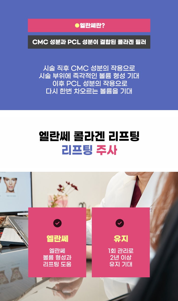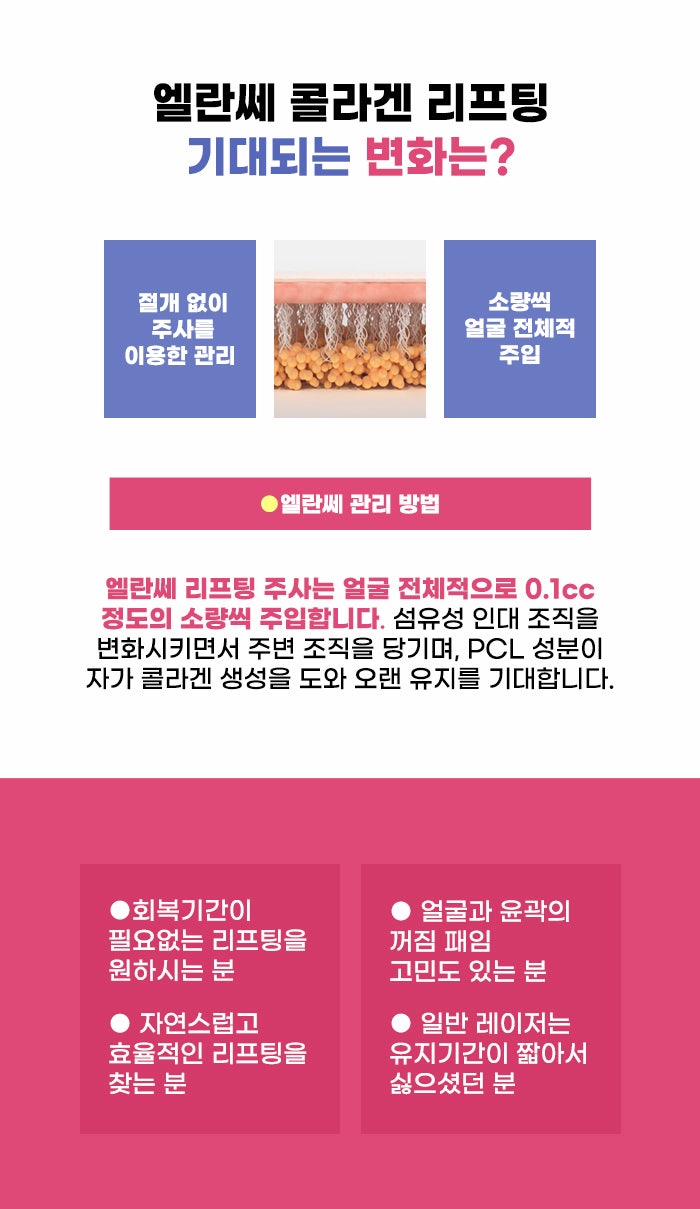엘란쎄 리프팅 관리의 경우 소량의 엘란쎄를 얼굴의 포인트별로 조금씩 주입하는 방식이라고 하는데요, 포인트별로 0.1cc 정도의 적은 양을 주입한다고 하며 이 주입된 엘란쎄가 섬유성 인대 조직을 변화시키고 주변 조직을 당기는 원리를 이용하게 된다고 합니다. 또한 엘란쎄의 PCL 성분이 콜라겐 생성을 이끌어내는 것도 기대할 수 있어 강한 리프팅, 오래가는 리프팅 변화를 기대할 수도 있다고 합니다.
