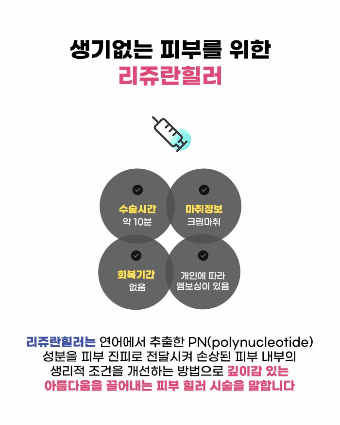 그리고 리프팅을 원하는 분의 경우 지치고 약해진 피부에 생기를 더하는 관리, 속건조 고민에 수분감을 더해주는 관리에 대해서도 알고 싶을 수 있는데요, 리쥬란힐러는 연어에서 추출한 PN 물질을 이용해 피부 장벽 강화를 돕는 관리라고 하니 참고해 보셨으면 좋겠습니다.