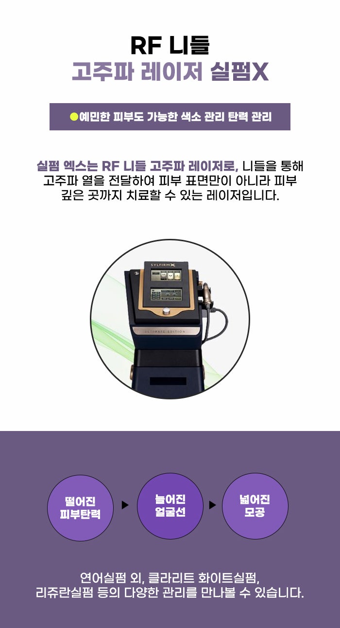압구정 엘란쎄 리프팅주사 관리를 찾기도 하지만, 복합적인 피부 고민에 변화를 만들 수 있는 관리가 궁금할 수도 있습니다. 실펌x의 경우에는 RF 니들 고주파 레이저를 이용하며 고주파 열을 피부 깊은 곳까지 전달하는 레이저 관리라고 하는데요, 혈관성 병변과 여드름, 여드름 흉터, 늘어진 모공, 색소와 리프팅 고민 등을 변화시킬 수도 있다고 하니 참고하셨으면 합니다~