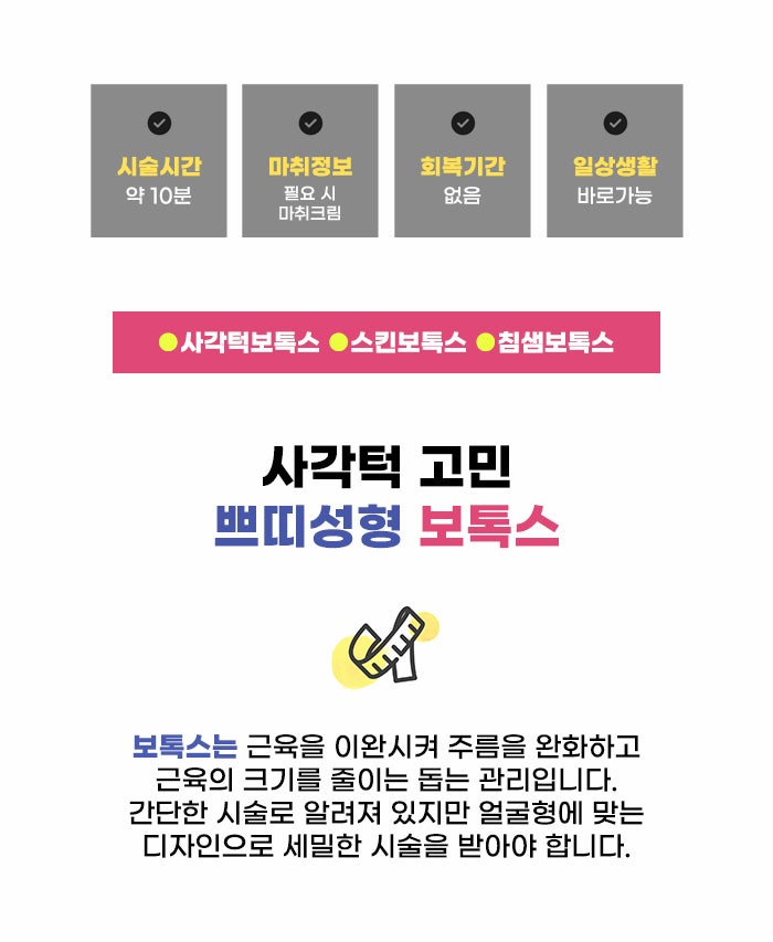 턱끝필러의 경우 얼굴선에 엣지를 더해주고 갸름하고 날렵한 얼굴을 원할 때 찾는 것 같은데요. 이때 턱선이 크고 각진 경우 다른 쁘띠성형 관리를 통해 각지고 커 보이는 턱선을 줄이고 싶을 수도 있습니다. 보톡스의 경우 근육의 크기를 줄이는 것을 기대할 수도 있는 관리라고 하는데요. 특히 사각턱 보톡스 관리는 많은 분이 찾는 관리인 것 같습니다.