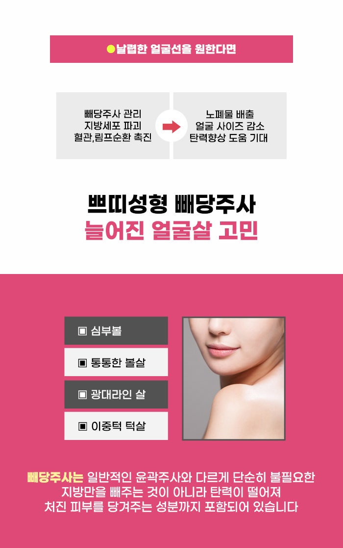 또한 지방이 많은 턱선의 경우 날렵한 턱선을 원하는 분에게 스트레스가 될 수도 있습니다. 내가 원하는 얼굴형을 갖는 데 이중턱, 턱살, 통통한 볼살, 광대라인 살 등이 방해가 될 수 있습니다. 이럴 때 불필요한 지방을 줄이고 탄력 업그레이드를 돕는 걸 기대하는 빼당주사에 대해서도 확인하셨으면 합니다!
