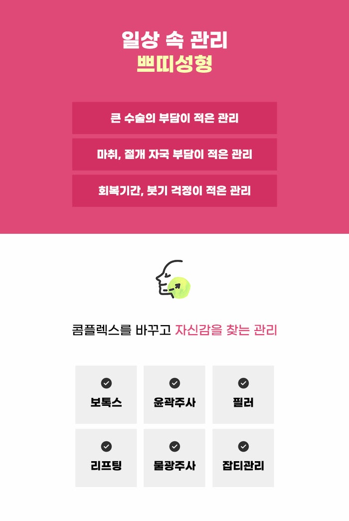 작다, 귀엽다란 뜻을 갖고 있는 쁘띠는 프랑스어 단어라고 하는데요. 이 쁘띠성형 관리를 원하는 분이 많아지면서 현재는 많은 분이 익숙하게 들어본 단어일 것 같습니다. 필러가 다양한 사람이 찾는 관리인 만큼, 강남 턱끝필러 추천 정보 알아보고 분이 많고, 또 필러 관리를 진행하는 곳도 여러 곳이 존재합니다. 하지만 간단해 보인다고 하더라도 무조건 아무 곳이나 선택해서는 안됩니다.