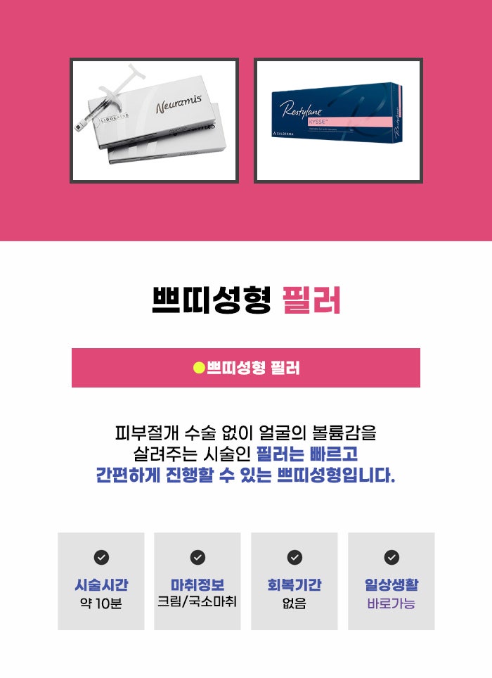 필러 관리는 주사 관리인데요. 관리 시간의 경우 약 10분 정도라고 하며, 부위에 따라서 그리고 개인에 따라서 다르지만, 관리 시간이 짧고 통증 부담이나 회복기간에 대한 부담 등이 적은 편이라고 합니다. 마취크림을 이용하거나 혹은 국소마취를 하고 진행하는 경우도 있다고 합니다. 특히 주사 관리이면서 즉각적인 변화를 느낄 수 있다는 점 등으로 인해 필러는 대표적인 쁘띠성형 관리로도 알려져 있는 것 같습니다.