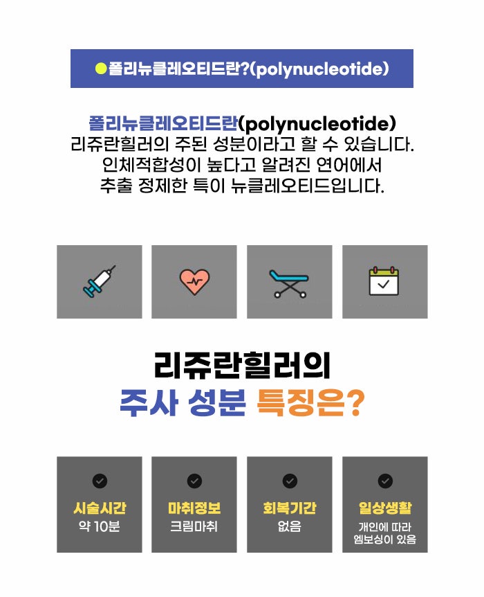 특이폴리뉴클레오티드를 통해 피부의 유수분 부족한 것을 채워주고 피부 장벽 강화를 기대할 수도 있다고 하는데요. 연령, 성별, 피부 특징 등에 따라서 가장 좋을 수 있는 리프팅, 강남 엘란쎄필러 등의 쁘띠성형 관리가 다를 수 있습니다. 그렇기에 먼저 내 피부 특징을 파악하는 게 더 나은 변화를 만들기 위해 중요하겠습니다.