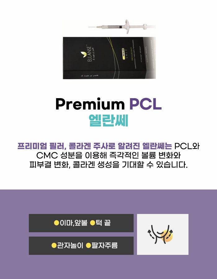 또 필러 관리 후에 더 오래 갔으면... 하는 바람을 갖기도 하는데요. 일반 필러와 다른 엘란쎄 필러가 이런 점에서 강점을 갖고 있다 보니 프리미엄 필러로도 불리면서 인기를 끌고 주목받는 것 같습니다. 엘란쎄 성분, PCL과 CMC 성분을 이용하는 필러 관리인데요. 견고하면서 오래 가는 편이라는 장점이 있다고 합니다. 그리고 관리 부위는 팔자주름, 관자놀이, 이마, 앞볼, 턱끝 등이라고 합니다.