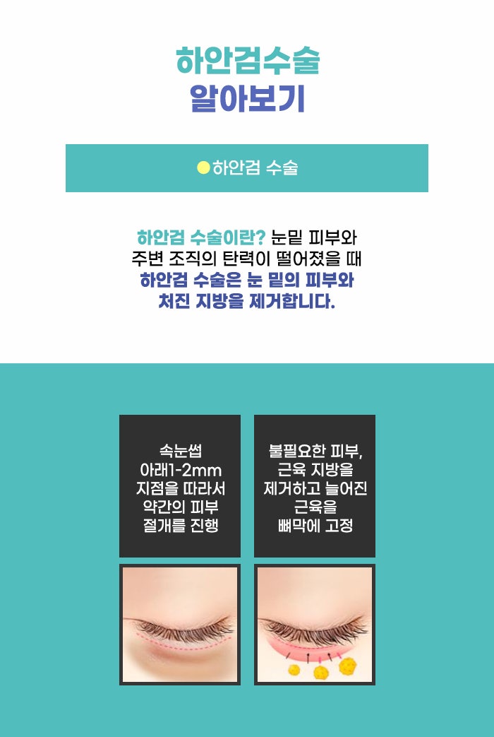 개인별 눈 형태, 늘어진 피부와 주름 등을 고려해 피부를 절개하는 방식의 <하안검 수술>을 찾아야 할 수도 있다고 합니다. 하안검 수술은 속눈썹 아래 1-2mm 지점을 따라서 약간 절개를 하며, 단기 수면마취를 통해 진행된다고 하는데요. 보통 소요되는 시간은 1시간 정도라고 알려져 있습니다. 필요하지 않은 피부, 조직을 절제하고 그리고 눈물고랑 패임이 있다면 <눈밑지방재배치>를 함께 진행하며 함몰된 부분의 볼륨을 다시 채울 수도 있다고 합니다.
