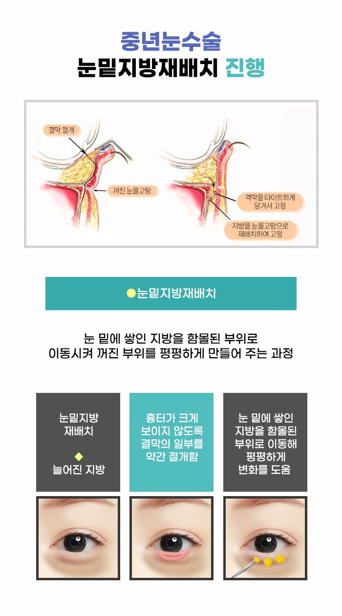 바로 눈 밑의 함몰이 있을 때인데요. 지방 처짐, 불룩한 지방 고민에 더해 눈물고랑 패임이라는 변화가 생기는 분도 있습니다. 튀어나온 부위와 별개로 눈 밑의 볼륨이 부족한 부분이 생기고 안륜근이 비쳐 보이면서 다크서클도 진해 보일 수 있습니다. 이럴 때 알아볼 수도 있는 방법이 바로 중년눈수술 <눈밑지방재배치>라고 합니다.