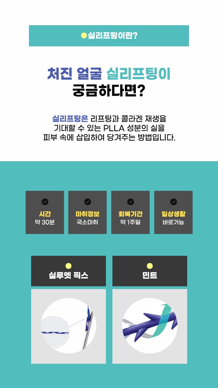 다만 엘란쎄 리프팅 관리와 비교해 보자면 통증이나 부기, 회복기간 등에 대한 우려가 좀 더 있는 편이라고 하는데요. 실리프팅의 특징, 장점은 어떤 게 있을까요? 실리프팅은 PLLA 성분의 실을 피부 속에 삽입하고, 당겨주는 관리라고 합니다. 탄력이 떨어지며 늘어진 피부, 처진 피부의 리프팅 그리고 이와 동시에 꺼진 부위에는 볼륨을 더해주는 변화를 기대할 수도 있다고 합니다.