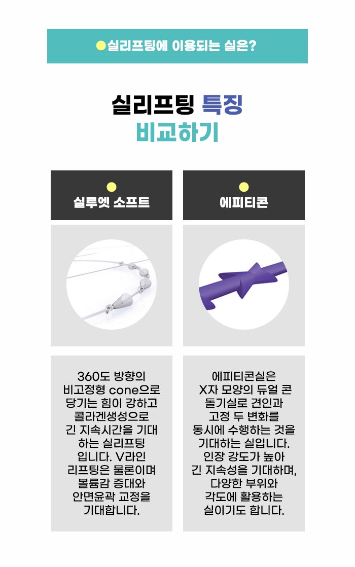실리프팅에 이용되는 실을 살펴보자면 민트, 에피티콘, 실루엣 픽스, 실루엣 소프트 등이 있습니다. 이중 실루엣 소프트는 비고정형 cone이 360도 방향으로 있는데요, 당기는 힘이 강하고 콜라겐 생성을 기대하는 실이라고 합니다. 이 실루엣 소프트를 실루엣 픽스와 함께 이용하기도 하는데요. 실루엣 픽스는 양방향 음각 구조의 PDO 실이라고 하며 더 탄탄한 피부 고정을 기대한다고 합니다.