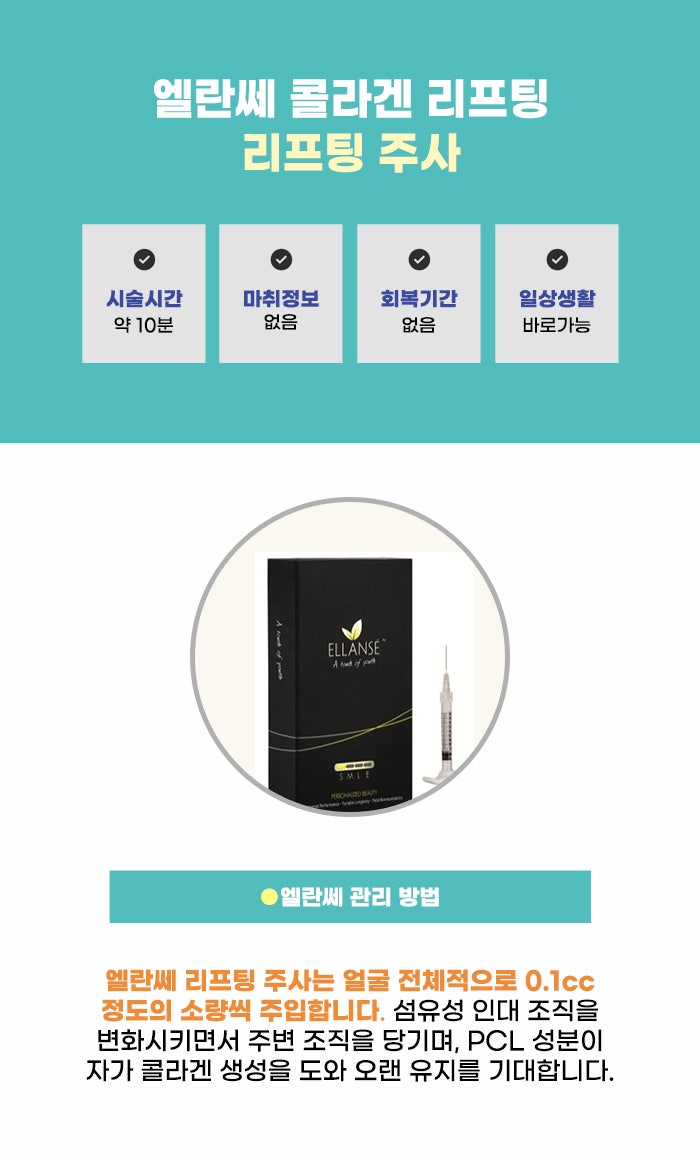 그리고 이렇게 특정 부위에 볼륨을 형성하는 엘란쎄 필러 관리 외에도, 소량씩 엘란쎄를 피부 포인트에 주입하며, 자연스러운 리프팅을 기대할 수도 있다고 알려져 있습니다. 각 포인트별로 0.1cc 정도의 소량을 주입한다고 하는데요. 엘란쎄 성분이 섬유성 인대 조직을 변화시켜 주고, 주변 조직을 당기며 리프팅을 기대할 수 있는 원리라고 합니다.