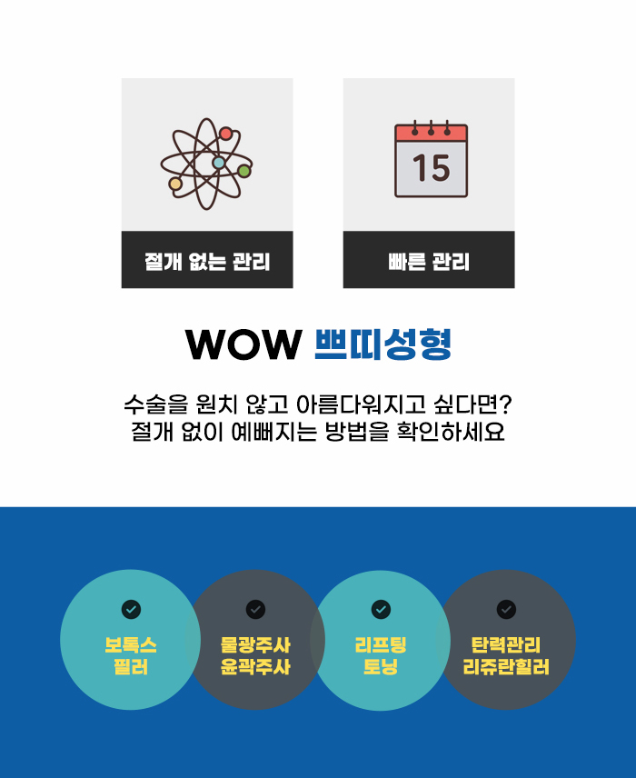 그리고 필러 관리만이 아니라 균형 잡힌 얼굴선을 위해 다른 쁘띠성형, 리프팅 관리를 할 수 있는지 확인하는 것도 필요할 것인데요. 보톡스의 경우 과도한 근육, 각지고 커 보이는 근육을 줄이는 데 도움을 기대할 수 있는 쁘띠성형 관리라고 합니다.