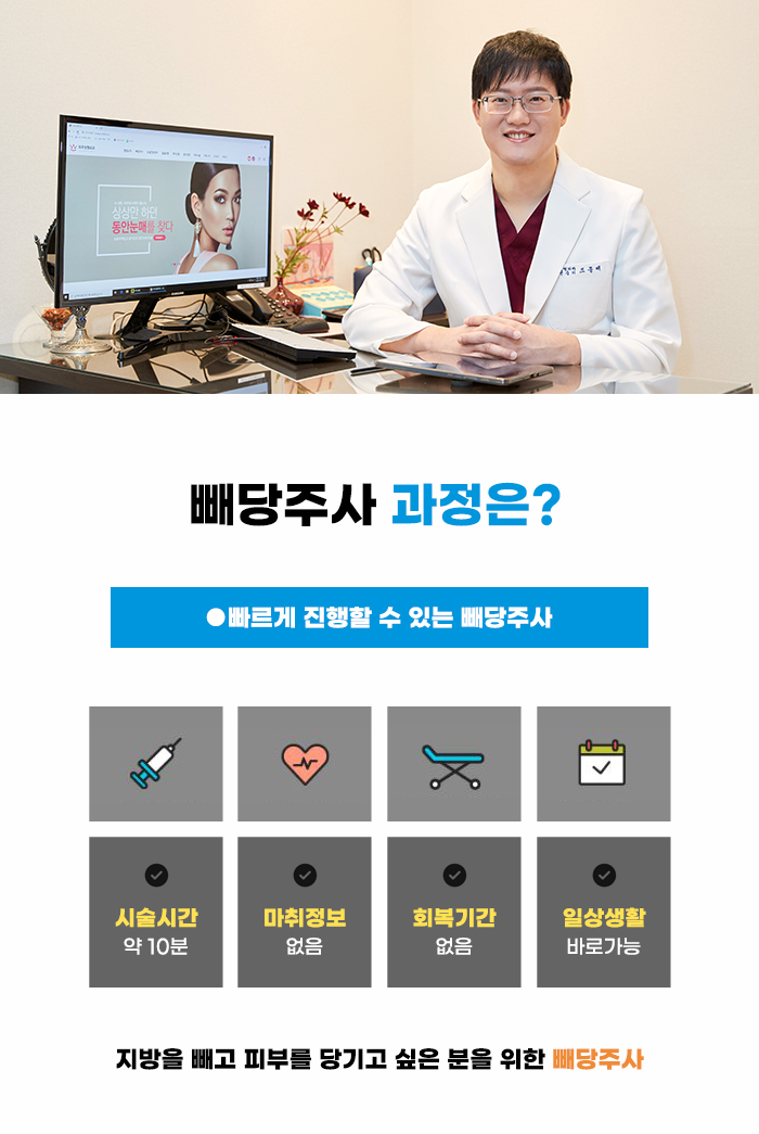 빼당주사의 경우 관리 시간이 짧고 마취의 부담, 통증의 부담도 덜한 편이라고 알려져 있습니다. 관리 후 일상적인 활동을 하기까지 오랜 시간 쉬어야 하는 게 아닌지, 부기가 심하고 오래 휴식해야 하는 건 아닐지 고민이 될 수도 있는데요, 빼당주사의 경우 관리 후 바로 일상적 활동을 할 수 있는 편이며 관리 시간도 약 10분 내외 정도라고 알려져 있습니다.