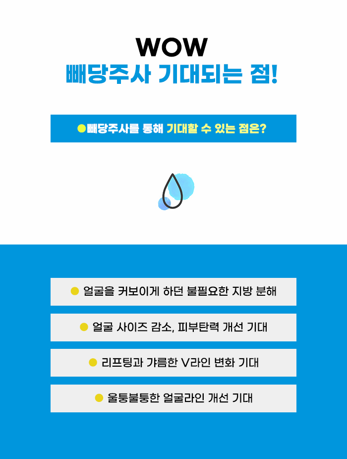 그런데 중요한 차이점이 있는데요, 보통의 윤곽주사는 지방을 빼는 것을 중점으로 하는 관리입니다. 빼당주사의 경우에도 얼굴의 살을 빼는 것을 돕는 관리이지만, 이것만이 아닌 장점이 있습니다. 바로 리프팅도 돕는다는 점입니다. 얼굴에 살이 많으면서 처짐이 우려되는 경우도 있는데요, 이렇게 얼굴의 살이 처지고 얼굴 라인이 울퉁불퉁해질 때, 빼당주사는 매끄러운 얼굴선을 찾는 데 도움을 기대할 수 있다고 합니다.