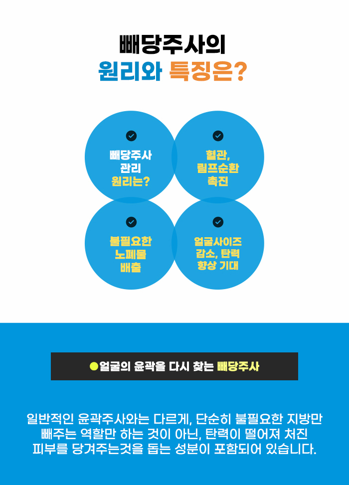 윤곽주사는 얼굴에 살이 많을 때 지방을 줄이는 것을 돕는 관리라고 하는데요, 주사 관리로 지방 분해를 돕는 약물을 이용한다고 합니다. 얼굴의 여러 곳에 적용할 수 있으며 골라서 살을 빼고 싶은 분이 이 관리를 찾고 있기도 합니다. 빼당주사의 경우에도 이런 윤곽주사의 장점을 느낄 수 있는 관리라고 합니다.