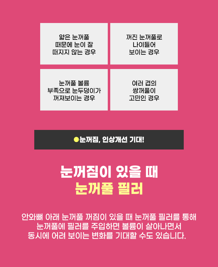 또한 눈꺼풀의 꺼짐, 지방이 줄어들고 어두워진 눈꺼풀 고민이 생기는 경우도 있습니다. 이 경우에는 필러제를 이용해 사라진 볼륨을 보충해 주는 관리인 눈꺼풀 필러 관리를 결정할 수도 있습니다. 이런 관리를 통해 눈매의 차이를 만들 수도 있다고 하니 참고하셨으면 합니다.