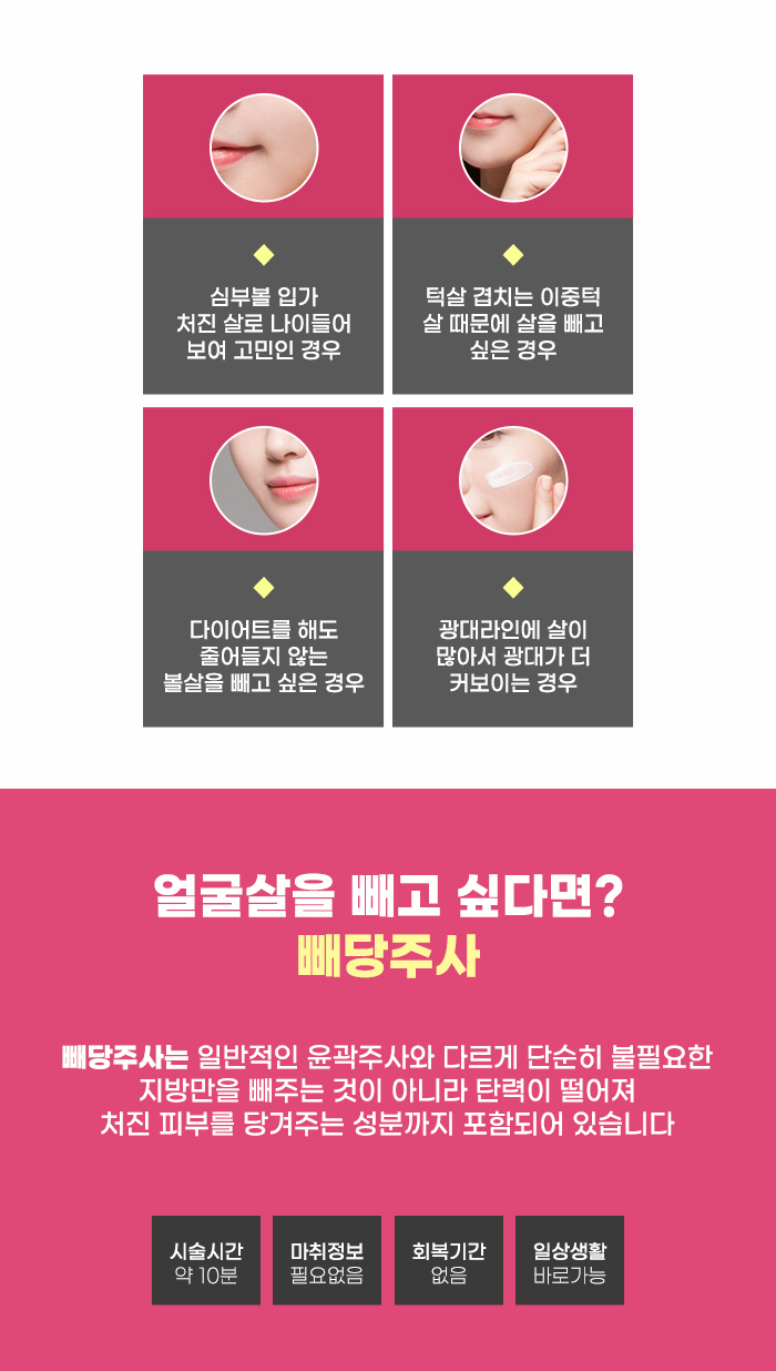 그리고 전체적으로 얼굴형을 살펴보았을 때, 관자놀이 부분이 꺼진 게 고민인 경우 해당 부위를 채우는 것만이 아니라 다른 관리를 결정하고 싶을 수도 있습니다. 얼굴의 볼살이나 광대뼈 부근에 살이 너무 많은 경우, 상대적으로 관자놀이 부분이 꺼지고 패여 보일 수도 있습니다. 하관 부분인 턱에 너무 살이 많고 라인이 둔해 보일 경우 전체적으로 균형이 맞지 않아 패임이 더 눈에 띌 수도 있는데요. 윤곽주사 빼당주사의 장점에 대해서도 확인해 보셨으면 합니다!
