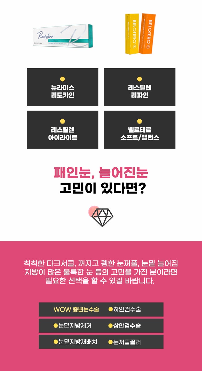 필러 관리를 받고 싶은 분, 강남 눈꺼풀필러 효과 정보 찾는 분의 경우, 다른 중년눈수술과 관련된 고민을 함께 갖고 있는 경우도 있을 수 있습니다. 눈꺼풀 피부가 지나치게 늘어진 경우, 시야를 가리고 눈 짓무름 고민을 만들기도 하는데요. 이런 경우 늘어진 피부를 절제하는 상안검 수술을 진행하는 경우도 있습니다.