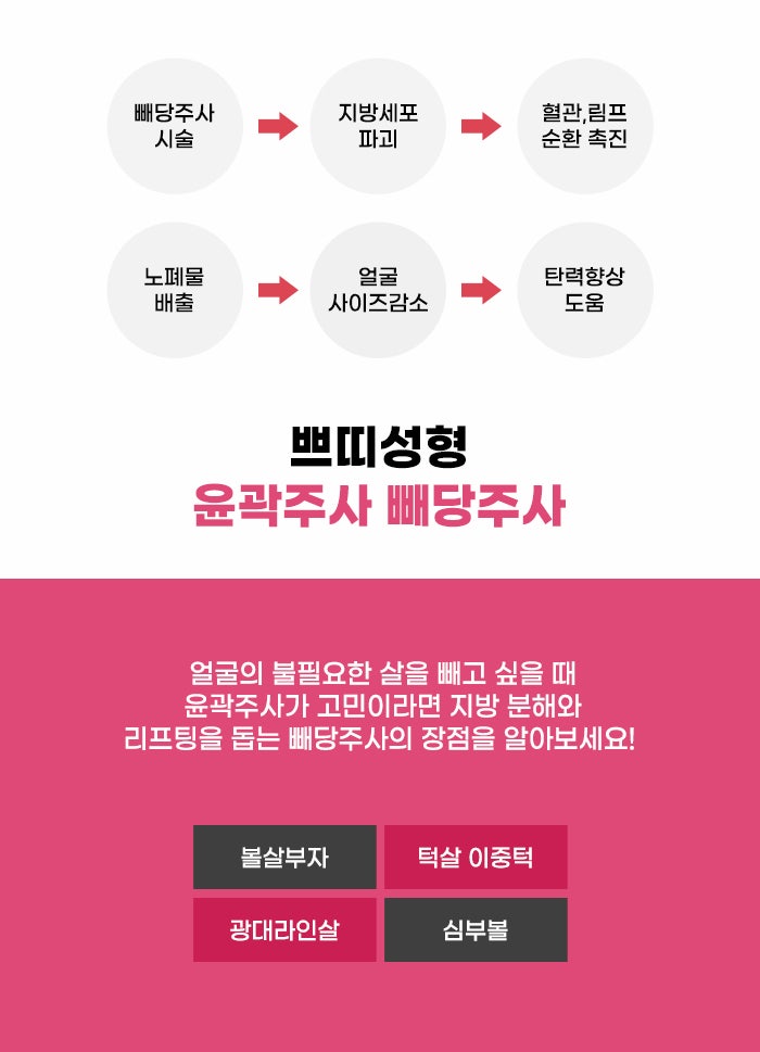 이럴 때 원하는 부분만 쏙쏙 골라서 없애고 싶다는 생각이 들 것 같은데요. 이런 이유로 강남 얼굴 지방분해주사 정보 찾아보실 수도 있다고 합니다. 쁘띠성형 관리 중 얼굴의 지방을 분해해주는 성분을 사용하는 주사 관리가 있는데요. 흔히 윤곽주사라는 말로 불리고 있습니다. 그리고 일반적인 윤곽주사와 다르게 리프팅도 돕는 것이 빼당주사라고 합니다.